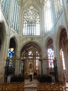 The nave and transepts are Romanesque, and excavations have shown that the Romanesque choir was demolished sometime between 1500 and 1525, to make room for a new choir in the so-called Flamboyant Gothic style, and given stained glass windows, which survived the Revolution, and are regarded as the most notable feature of the church.  The choir was bombed on 8 – 9 June 1940 and was fully restored after 1945.  The church was undergoing restoration to the façade when we visited recently—not before time, by the look of things!