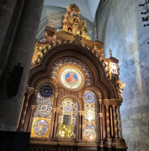 One great attraction for many visitors is a very elaborate astronomical clock with an impressive height of 12m, built in 1866, commissioned by the Bishop of Beauvais.  The clock contains nearly 90,000 components and features 50 miniature figurines and planetary movements.  In its lower section are 52 dials powered by motors that also ensure the functioning of the chimes.  The cathedral also has a smaller astronomical clock from the 14th century, known as the Canon Music Clock, which features a carillon (musical bells), located in the Chapel of Sainte-Thérèse.