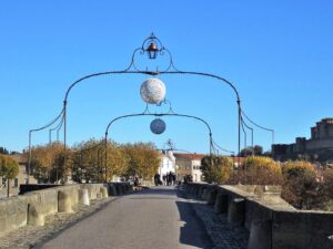 In 1260, a new Carcassonne, called the Bastide Saint-Louis, was created at the base of the hill of the ancient citadel, built on the left bank of the river Aude. Focussed on reaching the ancient citadel, many visitors don’t even notice the imposing gates across the Pont Vieux (old bridge) to this fascinating area that’s rich in history, architecture, cafés and restaurants, shops and markets. The Pont Vieux is a spot that gets packed at night with photographers attempting to capture the beauty of the citadel when it’s lit up against a starry sky. Built in the 14th century, the bridge was the only link between the two towns until the 19th century.