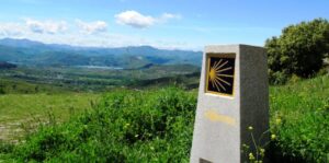 The scallop shell symbol and yellow arrows marking the pilgrimage route to Santiago de Compostela