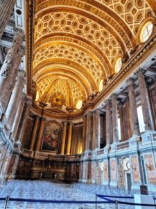 On this level is the Palatine Chapel, the grand private chapel of the royal family.  Much of the original artwork inside the chapel was lost during the war, with the altarpiece, an Immaculate Conception, being the only original piece.  There are numerous highly decorative, ceremonious rooms and an impressive throne room.  The Royal Palace of Caserta was the headquarters of the Allied forces during much of the Italian campaign of WW2.  The Italian Social Republic and Nazi Germany signed the formal surrender of their forces within the Italian peninsula in the palace on 29 April 1945.  The post war decades have seen a major conservation effort to sweep away the makeshift infill offices, mezzanine floors and other alterations required for military administration and return the Palace to its 18th century glory.
