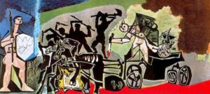 Also, notably, what’s also in Vallauris is the Picasso National Museum “War and Peace.”  Spanning over 100m2, this monumental painting was crafted on panels of hardboard.  It was painted in the artist’s studio in 1950 during the Korean War.  As a member of the French communist party, Picasso campaigned for the Peace Movement, designing the dove that would go on to be used around the world.  He decided to create an enormous work that would reflect his political views.  In 1951, during a dinner in the nave of the castle’s chapel held by the Vallauris potters in honour of his 70th birthday, Picasso expressed his desire to decorate the vaults.