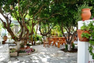 There is a good choice of accommodation, but wisely, as it turned out, we chose a small, family-run hotel a couple of streets back from the waterfront, that had a beautiful, leafy, quiet courtyard for guests’ use, and where a delightful breakfast was served every morning. The waterfront is lively, and filled with charming little cafes and tavernas, leafy, cobbled side streets, lined with smart little boutiques, a few good quality souvenir shops—a number featuring items locally made from olive wood—and a selection of shops mostly for local patronage, indicating that the island isn’t just kept alive for visitors–as is the case with some destinations.